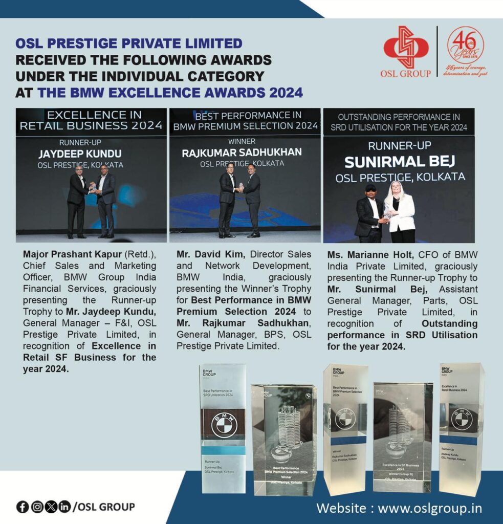 Major Prashant Kapur (Retd.), Chief Sales and Marketing Officer, BMW Group India Financial Services, graciously presenting the Runner-up Trophy to Mr. Jaydeep Kundu, General Manager – F&l, OSL Prestige Private Limited, in recognition of Excellence in Retail SF Business for the year 2024.